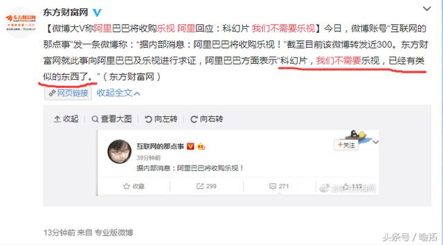 昨天中午,微博大V互联网那点事突然爆料“据内部消息:阿里巴巴将收购乐视”,此话一出,一语惊人,为此有媒体求证阿里巴巴,结果十分尴尬,阿里称“科幻片,我们不需要乐视,已经有类似的东西了”。乐视方面则表示“没听说过这件事”。